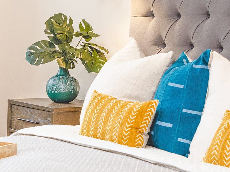 This bundle features five items in total, all pulled from our African Mud Cloth line. Excuse the overconfidence, but we think this bundle truly threads needle thanks to a balance of beautiful colors and styles resulting in a gorgeous collection of handmade designer boho bed pillows 100% ready to brighten your bedroom. This foundation of this bundle is anchored with the subtle off-whites of two MIA pillows (details below) which is a customer favorite and a top seller.  Adding an additional layer of balance and vibrance to this set is the AVERY with its calming oceanic greens and aquas. And the final touch that completes this set are the two OPHIR pillows and their striking chevron repeating patterns stitched over the glowing, warm gold tones.  BUY THE SET AND SAVE 15%