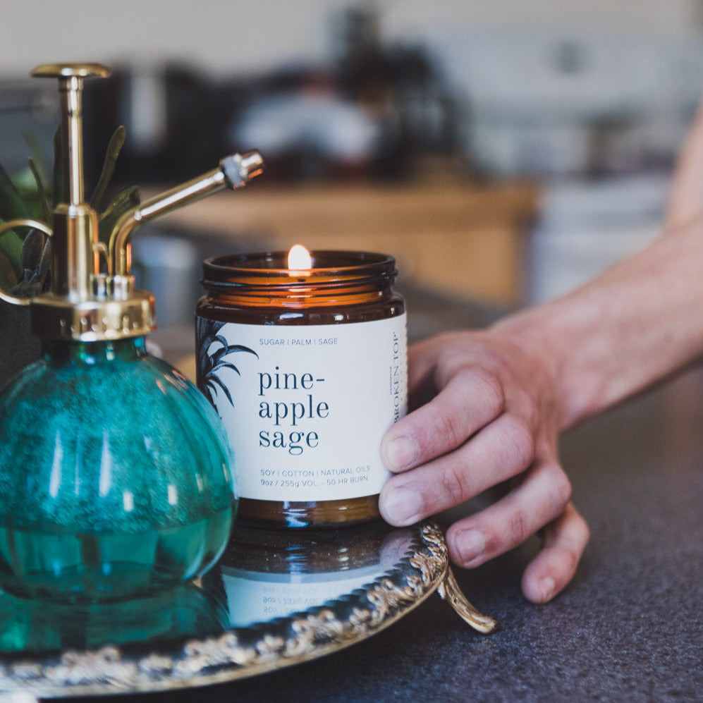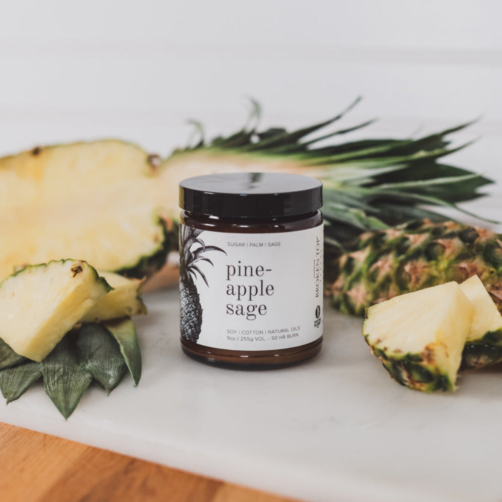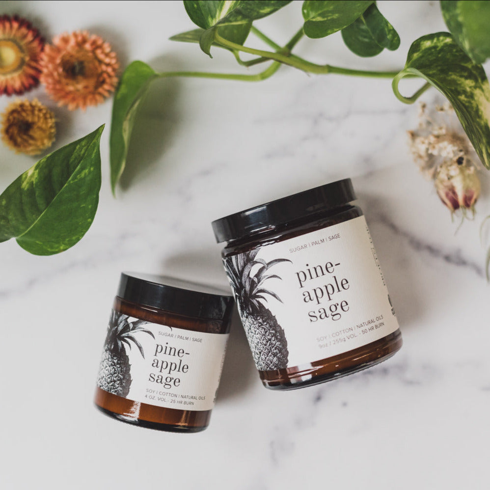 Pineapple Sage is a handcrafted scent that captures fruity palm top notes, followed by a minty sage base. The remaining sugar scent gives off a complex burn that will bring bright energy to your space. The tropics are calling, and pineapple sage is ready to help you get there.