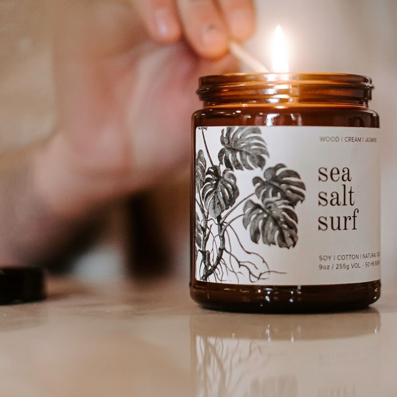 Sea Salt Surf scent flaunts notes of jasmine followed by sweet cream and a hint of driftwood. Jasmine emits the perfect flowery bridge between sweet and salty, adding crisp foliage notes to this beachy scent. A top seller in Hawaii and tropical states, this scent creates a memory of the warm salt air, sweet adult drinks, and beach thoughts.